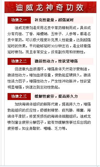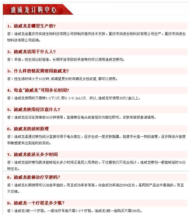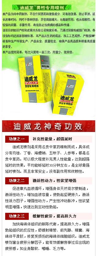 | 迪威龙喷剂介绍:迪威龙男性延时喷剂是指迪威龙品牌男性外用的延时喷 剂,通俗简称为延时喷 剂,也可简称迪威龙喷 剂。它是归属于养生用品一类的,与##,内服,不是保健品喷 剂,外用。迪威龙是通过国家权威部门相关检测的养生品,其产权和成果为重庆市圳凌生物公司独家所有,能有效克制男性房事时间过快症状。