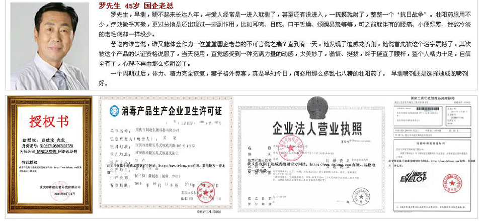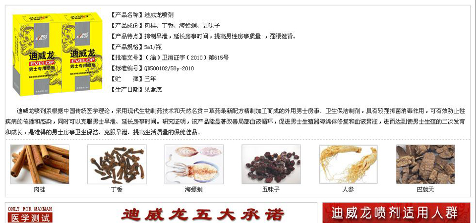 迪威龙男性延时喷 剂项目的知识产权和成果均为重庆市圳凌生物科技有限公司独家所有,通过国家权威部门检测,各项指标均达国家部颁标准。本产品从生药到成品,加工工艺成熟,严格按GMP标准和生产环境生产、产品安全、质量稳定。确保产品高品质和顾客高质量的享受 |
